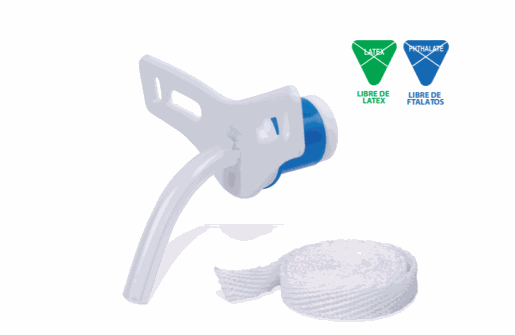 Cánula de PVC, curva, flexible, transparente, línea longitudinal opaca a rayos X, orificio distal pulido, atraumático. Plaqueta de fijación flexible, con conector estándar. Balón de baja presión, balón piloto y válvula de retención. Mandril de introducción punta oliva. Cinta velour con velcro para sujeción al cuello